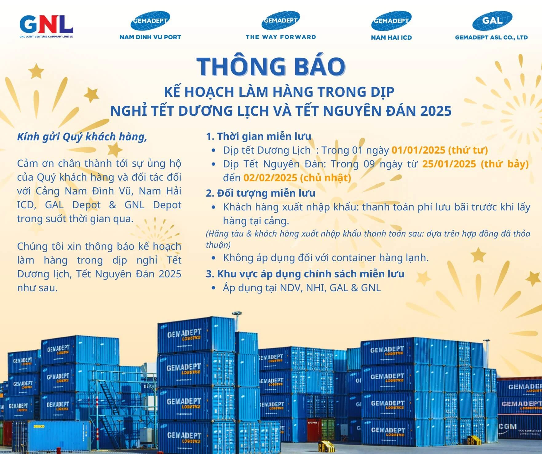 Thông báo: Kế hoạch làm hàng tại cảng Nam Đình Vũ – Nam Hải ICD, GAL depot, GNL depot trong dịp lễ Quốc khánh Việt Nam 02/09/2024