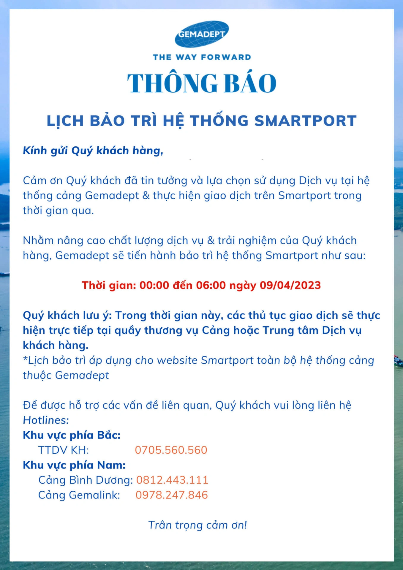 Thông báo: Lịch bảo trì hệ thống SMART PORT ngày 09/04/2023