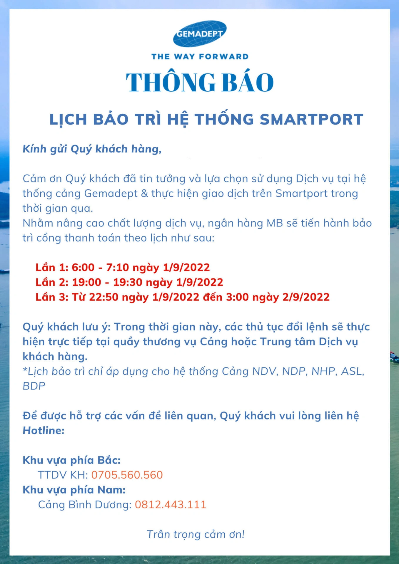 Thông báo: Lịch bảo trì hệ thống Smart Port từ ngày 01/09/2022 đến ngày 02/09/2022