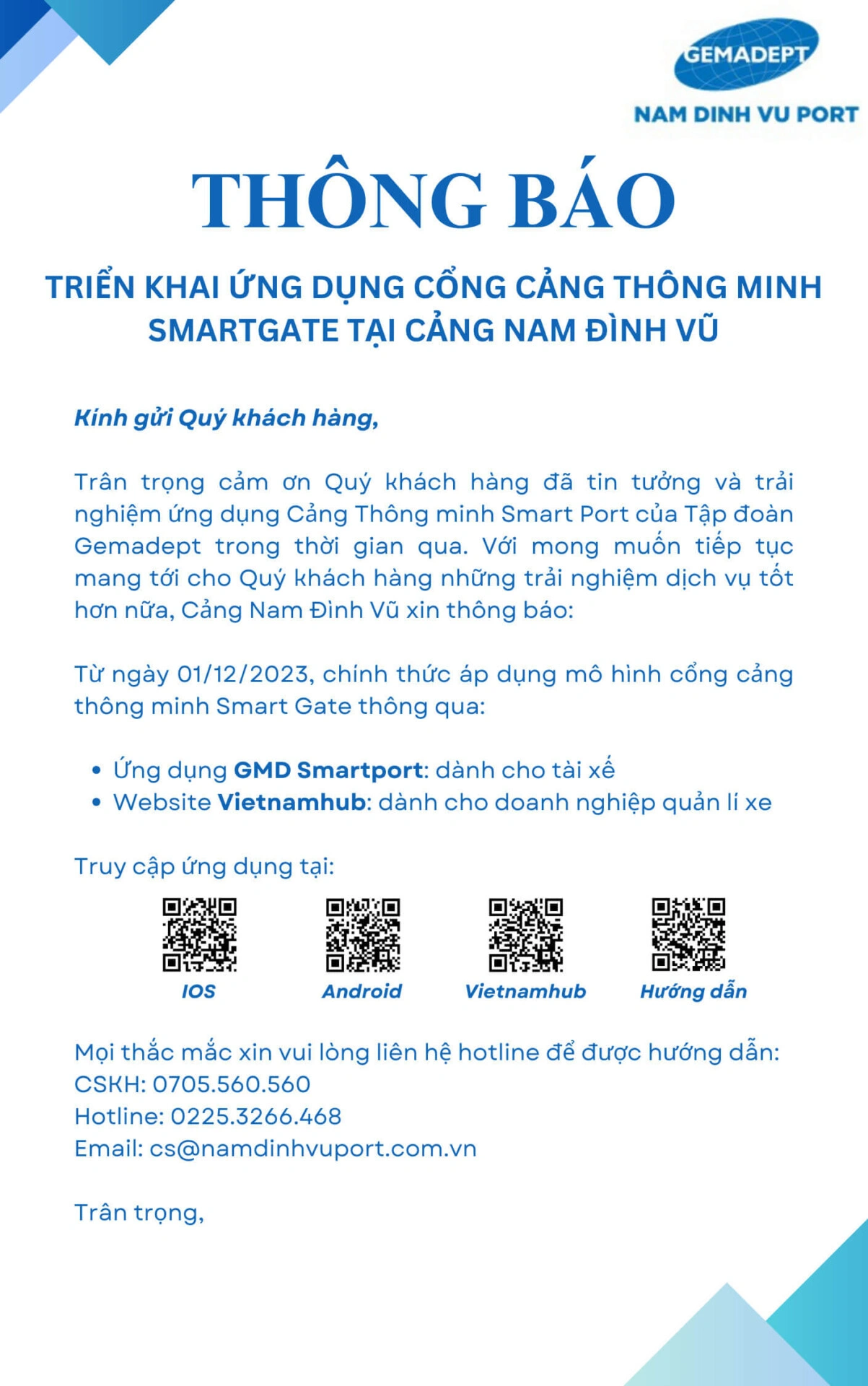 Thông báo: Triển khai ứng dụng cổng cảng thông minh Smart Gate tại Cảng Nam Đình Vũ từ ngày 01/12/2023